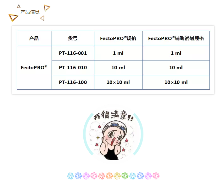 FectoPRO?保證不含動物源成分,且限定化學成分。每個生產批次都經過系統化的批次管理和出廠測試。采用先進的質控流程:蛋白質生產率、細胞活性及完全無菌。
