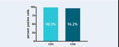 以Fab-TACS細胞分選重力柱分離CD3+及CD4+細胞,圖中為五次獨立實驗的平均分選結果。Fab-TACS科技能穩定的從全血中分選出多量的目標細胞。