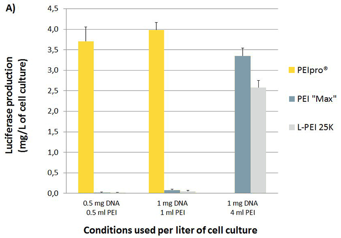 與其它PEIs相比,PEIpro?所需更少轉染試劑和較少/相似的DNA用量