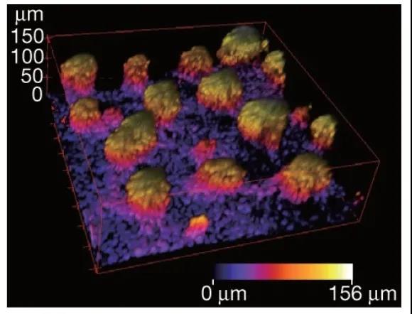圖像以三維(3D)方式堆疊,并根據從下到上的距離來著色。