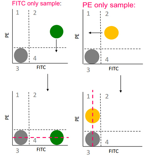 對于熒光補償的確定,需運用以上補償的基本原理并結合特定的標本來實現。以FITC,PE雙色分析為例:
