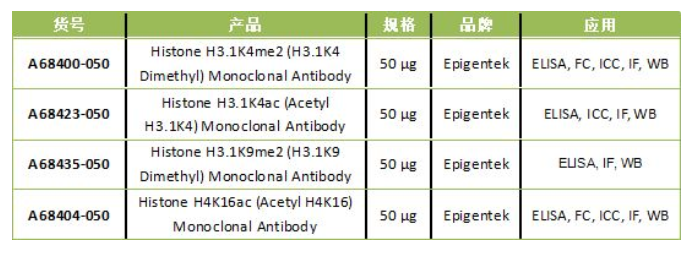 Epigentek提供多種新型兔單克隆抗體,用于表觀遺傳學(xué)研究。與傳統(tǒng)的小鼠單克隆抗體相比,這些抗體提供更高親和力,更高特異性,更好地識別抗原表位。